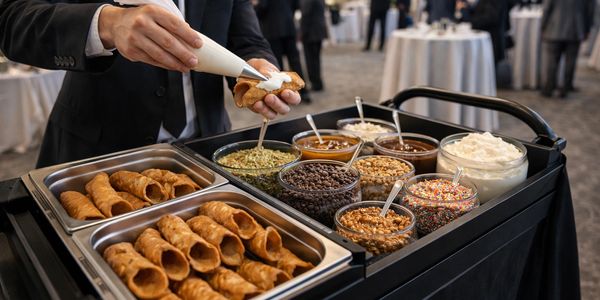 Delight your guests with an interactive dessert experience! Our Signature Cannoli Station lets everyone create their own gourmet cannoli, choosing from a variety of fresh fillings, decadent drizzles, and irresistible toppings. Perfect for weddings, corporate events, or any celebration, this station brings a touch of Italian charm and a dash of fun to your special day — a sweet memory your guests will never forget.